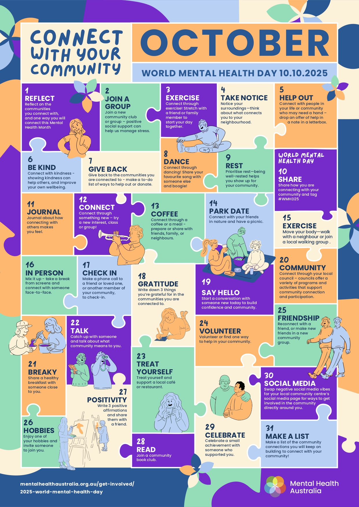 Mental Health Australia’s theme for World Mental Health Day is Connect with your community, encouraging everyone to connect with the communities that matter to them. Connecting with our communities can help us feel cared for and supported, which is good for our mental health.