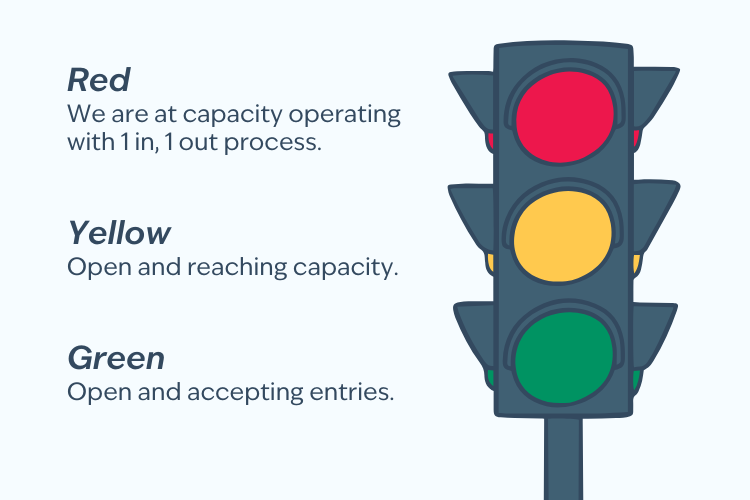 Red – we are currently at capacity and operating with 1 in, 1 out processes